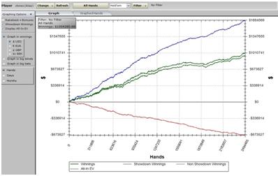 Боты играют очень хорошо. Существуют целые команды разработчиков, которые денно и нощно корпят над постоянным улучшением своих программ. Ниже представлен график, на котором отображён результат игры 104 аккаунтов с общим винрейтом 4.12 бб / 100 на довольно продолжительном отрезке дистанции: