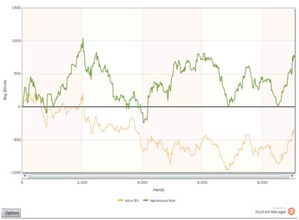 На данный же момент моей целью является доскональное изучение самых-самых основных принципов игры в PLO, построение «фундамента». Я знаю, что у моей игры пока много недостатков. Это подтверждается как моими результатами, так и тем чувством неуверенности и неопределённости, которое я иногда испытываю в тех трудных для меня ситуациях, когда я совершенно не понимаю, как следует сыграть. В случае с NLHE — совсем другое дело. Там я практически всегда могу сказать, совершил ли я ошибку, а также назвать её. Зачастую причиной ошибок была игра за слишком большим количеством столов, по невнимательности. В PLO я могу играть один стол и всё равно не понимать, что к чему, в некоторых ситуациях. На момент написания статьи мои результаты на короткой дистанции хорошо характеризуют мою игру, нестабильную и с большим количеством ошибок: