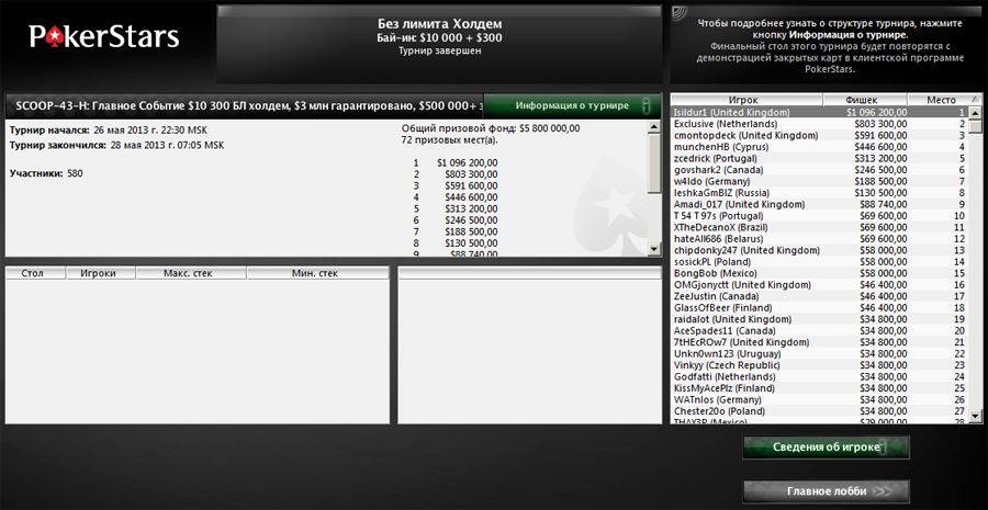 О результатах серии SCOOP 2013 на PokerStars можно узнать из официального итогового поста, в котором собрана статистика со всей серии. Не смотря на то, что россиян среди всех участников SCOOP было больше всего, Россия забрала только 16 побед, уступив по этому показателю Великобритании и Канаде. По общему количеству выигранных дeнeг, Россия также заняла третье место, уступив все тем же верноподданным Королеве и игрокам из страны кленового листа.