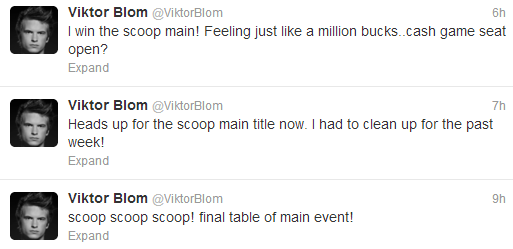 Начиная с попадания на финальный стол, Блум “праздновал” заметками в твиттер каждый из ключевых этапов этой победы – собственно финальный стол, хедз-ап и победу. Не смотря на долгую МТТ-зарубу, Виктор вовсе не собирался сразу после заноса идти спать, а первым делом поинтересовался – кто готов рискнуть сесть за дорогие кэш-столы и попытаться отобрать его выигрыш… О результатах этой затеи узнаем из очередного обзора хайстейкс-полей совсем скоро. :)