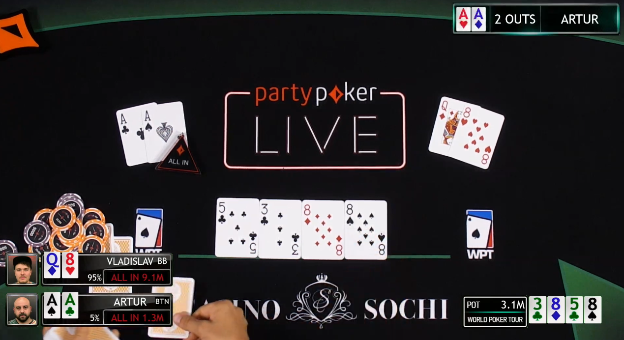 Турнир, к слову, также закончился после переезда в пользу Владислава. В последней раздаче против Артура Адамянца он выставился на флопе с Q8 и уже на тёрне словил нужный аут для победы. Эффективная глубина была менее 9 больших блайндов.