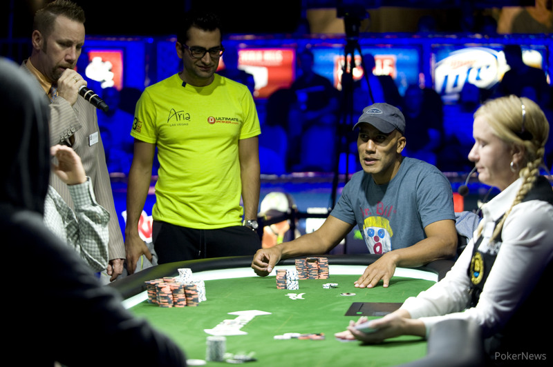 Через десять минут за Антонио последовал и его друг - воротила серьезного бизнеса на западе США - Билл Перкенс. Оставшись коротким стеком, бизнесмен получил колл на свое выставление с A