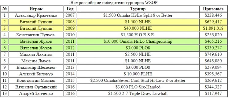 Еще один двукратный победитель турниров WSOP Вячеслав Жуков. В 2011 выиграл турнир по Омахе Hi/Lo за $10,000 (+$465К), а в 2012 по Омахе 8 за $3,000 (+$330К). Также он был близок к победе еще в двух турнирах, но в 2015 году, в турнире по HORSE за $10,000 стал раннер-апом и выиграл чуть меньше $320,000, и в турнире за $2,500 по Омахе/Стад Хай-лоу стал четвёртым.