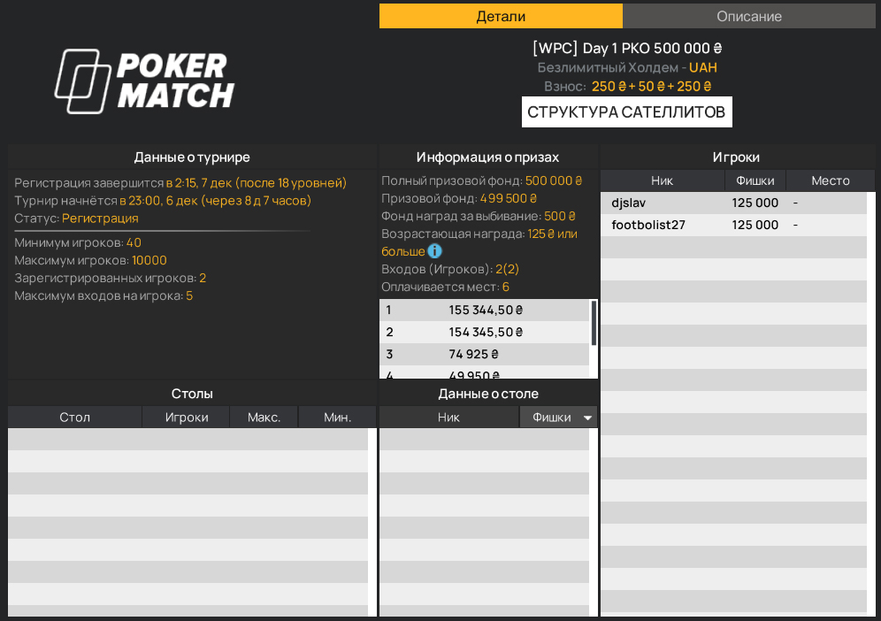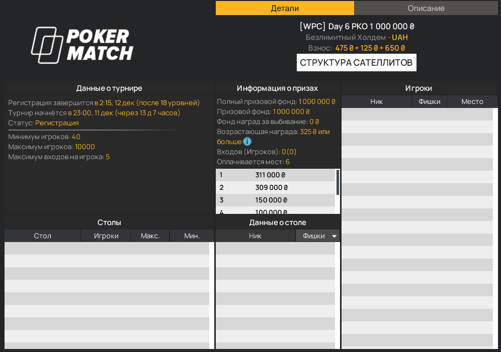 | Турнир | Бай-ин, грн | Гарантия, грн | Время старта, МСК |