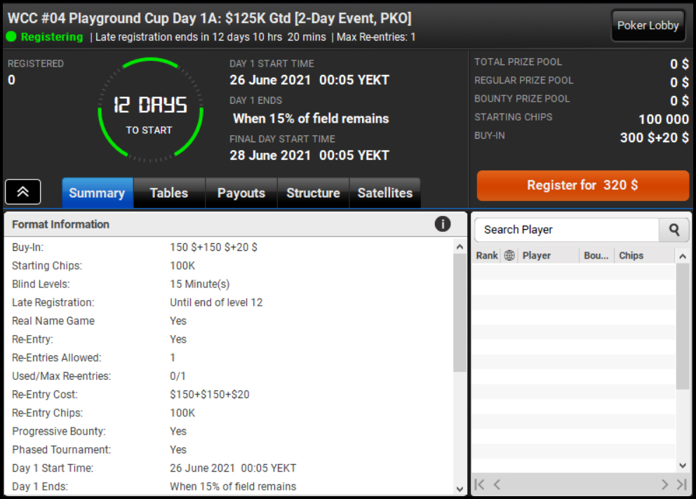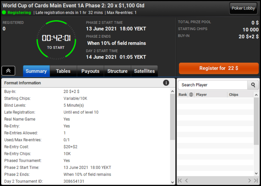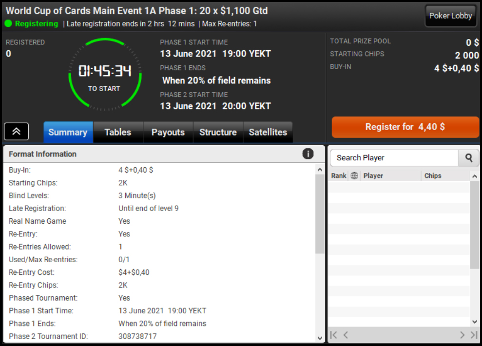 С 16 июня по 5 июля на partypoker проходит World Cup of Cards. C 2017 по 2019 эта серия проводилась офлайн в покерном клубе Playground в Канаде, но в 2020 была отменена из-за пандемии, а в 2021 — как и многие другие покерные серии — перенесена в онлайн.
