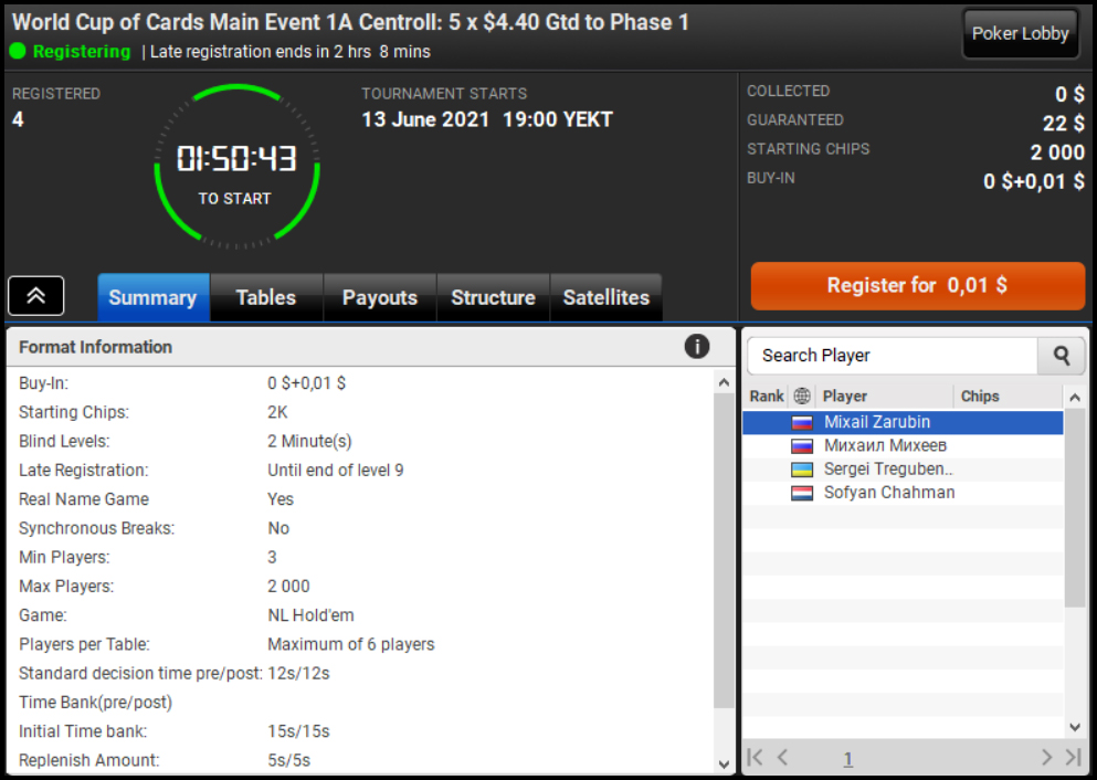 Шаг 1 — Центролл. Турнир за $0.01 с гарантией 5 билетов в $4.40 Phase 1. Стартовый стек — 20 ББ, поздняя регистрация — 9 уровней по 2 минуты. Стартуют каждый час в течение дня с 13:00 до 17:00 МСК.