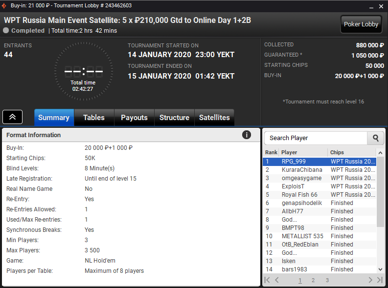 Игрокам высоких лимитов, которые собираются посетить Сочи, советуем обратить внимание на оверлейные саты за ₽21,000 рублей с гарантией 5 билетов за ₽210,000 в Главное Событие. Как пример — вчерашний сателлит не добрал 6 входов из 50 нужных. Ближайший такой стартует 15 января в 21:00 МСК.