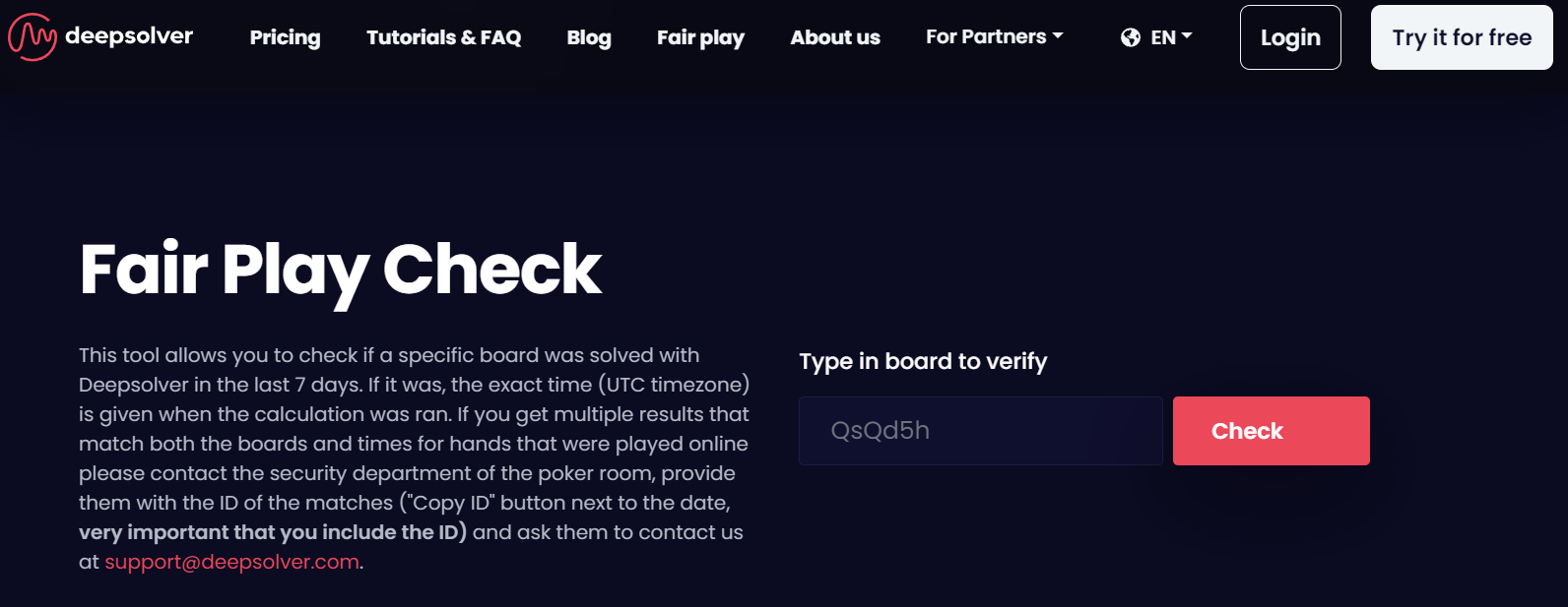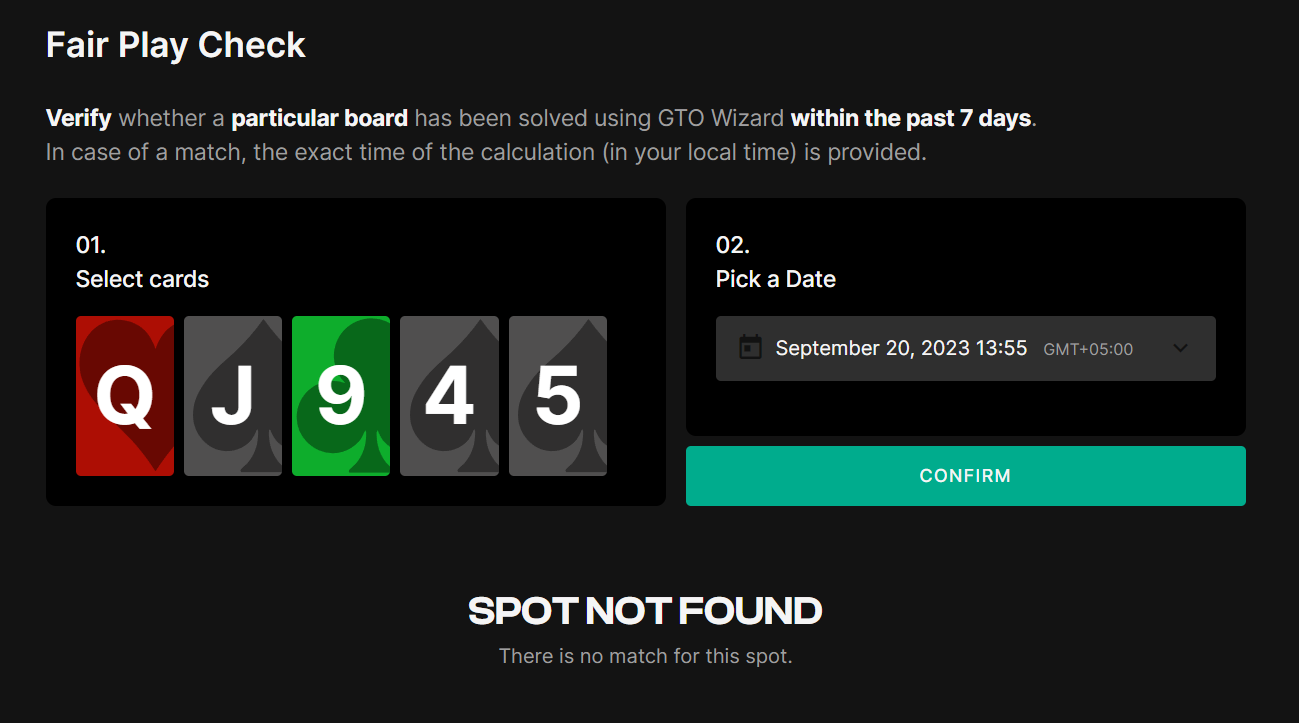 Примечательно, что Fair Play Check не является в полном смысле новинкой для покерного сообщества. На сайте Deepsolver любому человеку бесплатно доступна возможность проверить, искал ли кто-то конкретный борд за последние 7 дней через этот солвер. Если обнаруживается совпадение, сайт отображает время, когда борд проверялся, и позволяет скопировать ID раздачи для направления информации оператору.