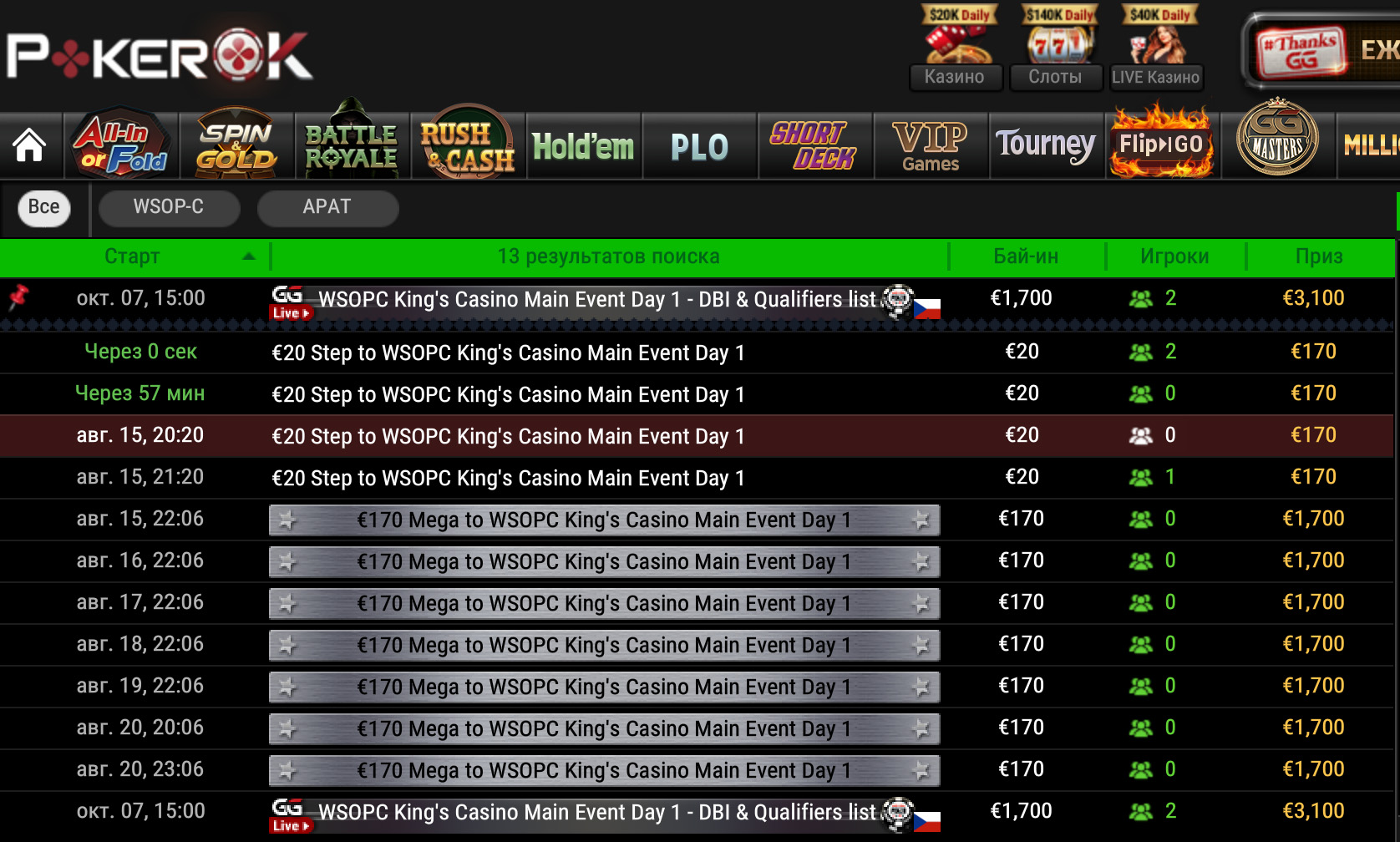 Пройти отбор в Main Event можно в сателлитах на ПокерОК. Каждый день в 22:06 МСК проходит €170 Mega Satellite с гарантиями по 1 билету в каждом. Попасть в сателлит можно через степ-сателлиты за €20.