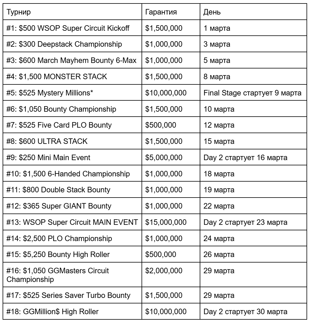 На серии игроков ждут 18 турниров с общей гарантией $56,500,000 — они все стартуют в 21:00 МСК, независимо от типа и дня: