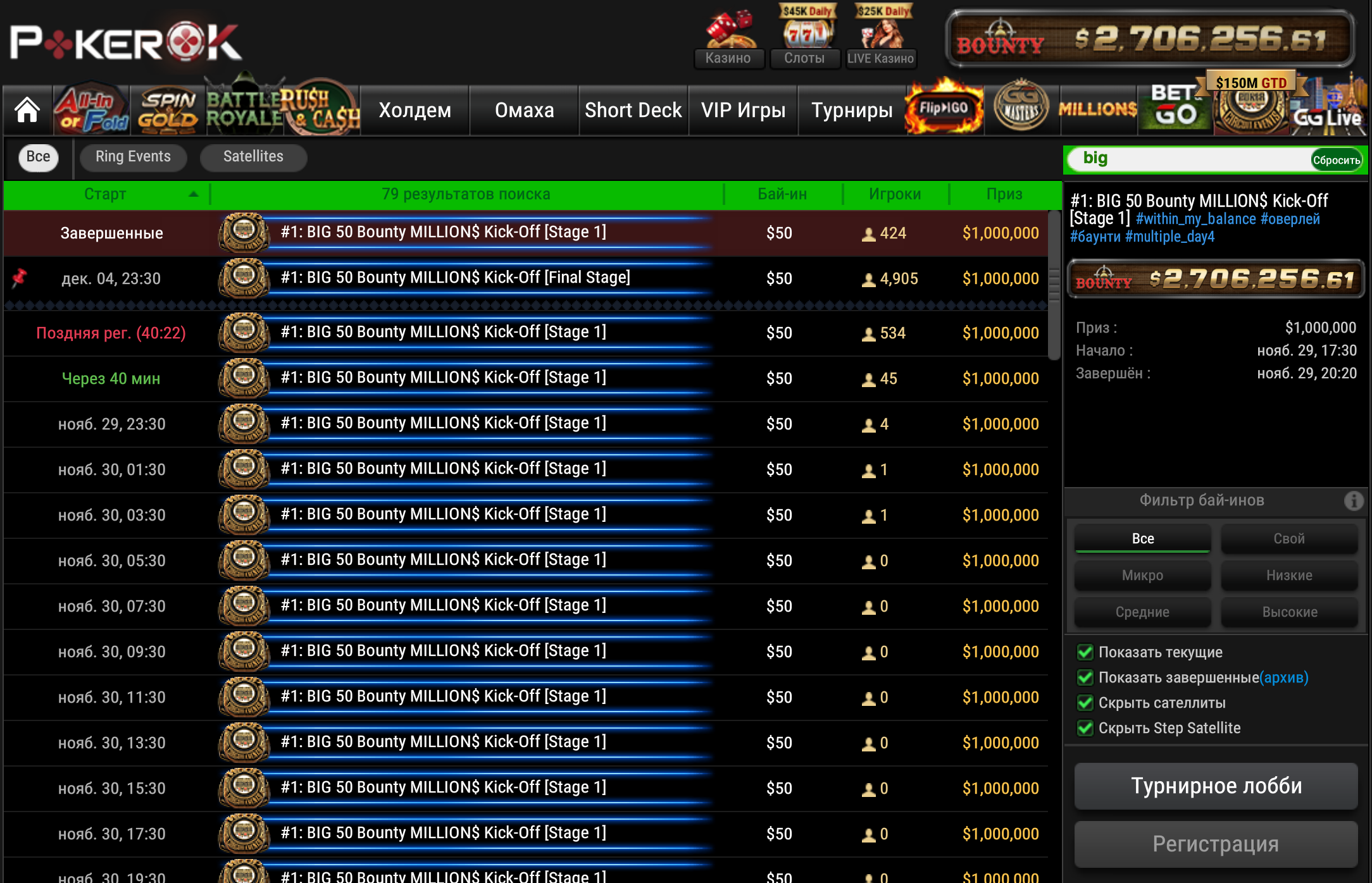 Big 50 MILLION$ Kick Off $1M GTD в этом году проходит в формате PKO. Стейджи уже идут. Можно сыграть сколько угодно стейджей, стеки и награды за выбивание суммируются.