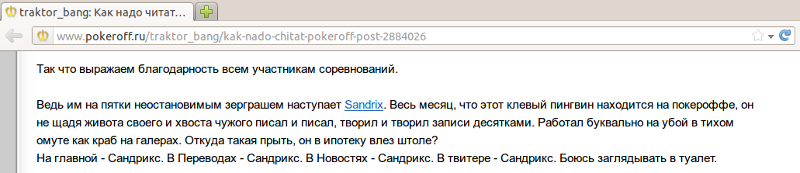 Здесь стоит сделать небольшую ремарку и отметить другую важную особенность этого сайта. Дело в том, что возможность попасть на главную страницу и получить от пары сотен до нескольких тысяч просмотров своего поста есть абсолютно у каждого пользователя Pokeroff, а не только у самых матёрых представителей PRO-TOP'ки. Блоговая структура вкупе с системой рейтинга и отображением последних обновлений на главной странице довольно неплохо, на мой взгляд, отделяет «мух от котлет» и выводит в топ, в основном, лишь самый смак покерного креатива. Разумеется, бывают и исключения, однако общая тенденция именно такая. То есть, нужно всего лишь приложить некоторые усилия и написать хороший пост — успех не заставит себя долго ждать. Во всяком случае, у меня это происходило именно так. Менее, чем за два месяца и около двадцати записей на сайте мне удалось попасть в топ-16 пользователей Pokeroff и стать более-менее известным среди местных. Стоит ли говорить, как резко взлетели в цене «акции» моего контента, когда обо мне написал Сам, раздув моё и без того опухшее чувство собственной важности: