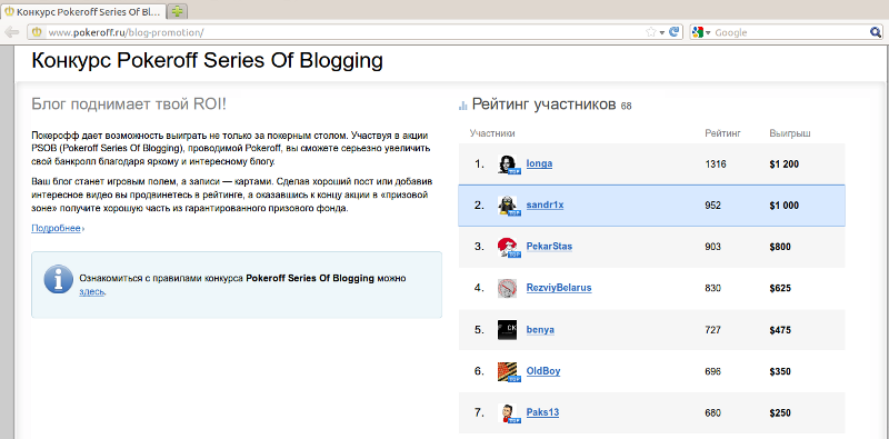 3. PSOB — это всё-таки скорее добро, чем зло. Благодаря гибкой системе рейтинговых оценок, когда блогеру засчитывается лишь одна максимальная оценка от каждого проголосовавшего за него пользователя, волей-неволей приходится писать разнопланово. То есть, выражаясь покерной терминологией, необходимо уметь писать «на широком диапазоне» тем, чтобы смочь заинтересовать как можно большее количество читателей. А публика на Pokeroff подобралась как раз довольно разношёрстная, что также не может не радовать, ведь в том числе благодаря этому мой контакт-лист пополнился новыми интересными людьми.