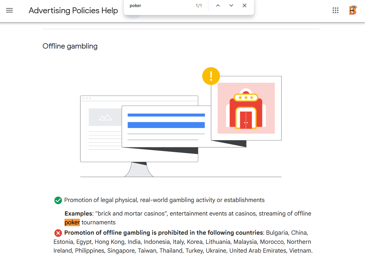 Онлайн-покер ни в одном из этих документов не упомянут. Покер в целом фигурирует только в одной секции «Offline gambling» политики рекламы Гугла — и там разрешен стриминг офлайн-турниров по покеру: