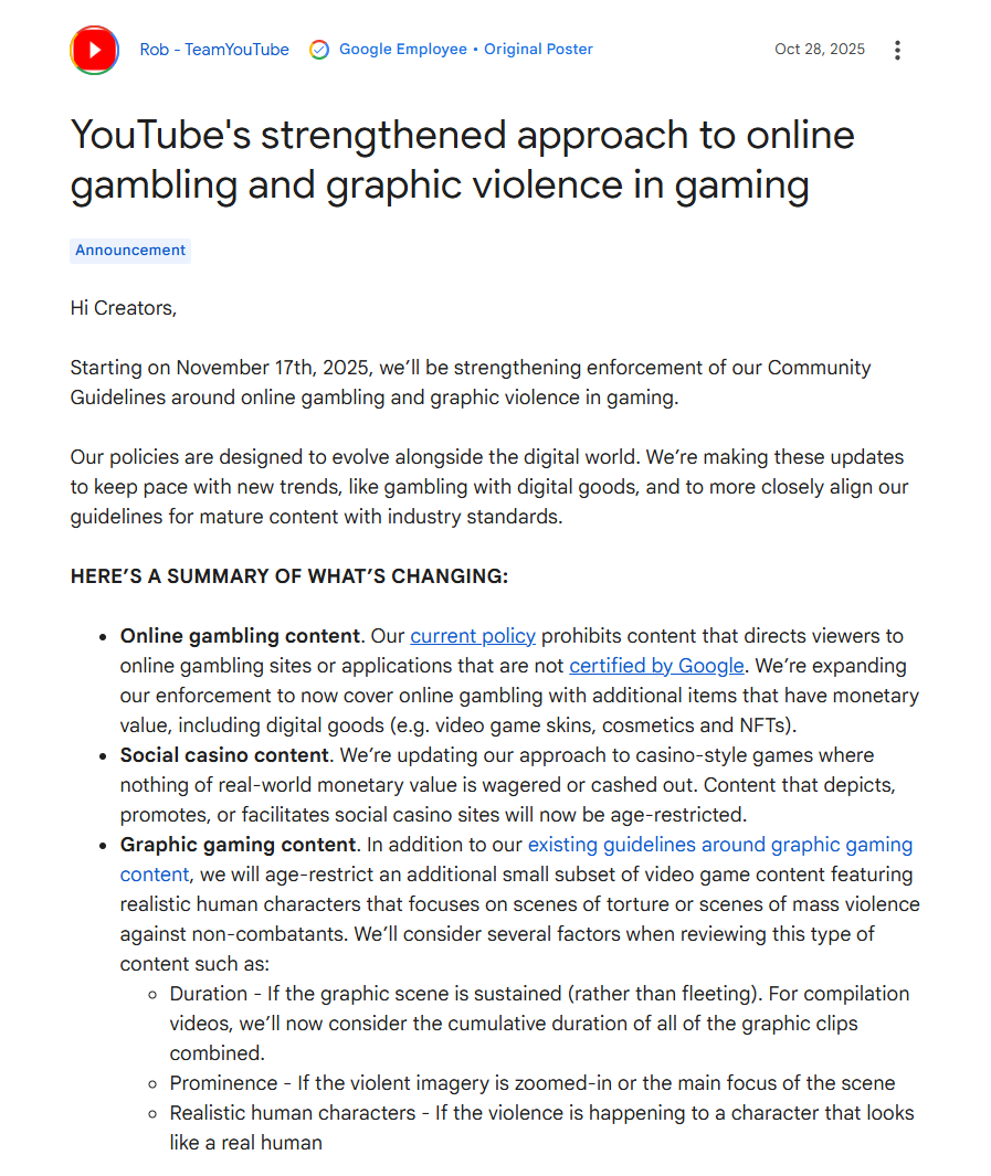С 17 ноября 2025 года YouTube опять усиливает контроль над онлайн-гемблингом вкупе с графическим насилием в играх.