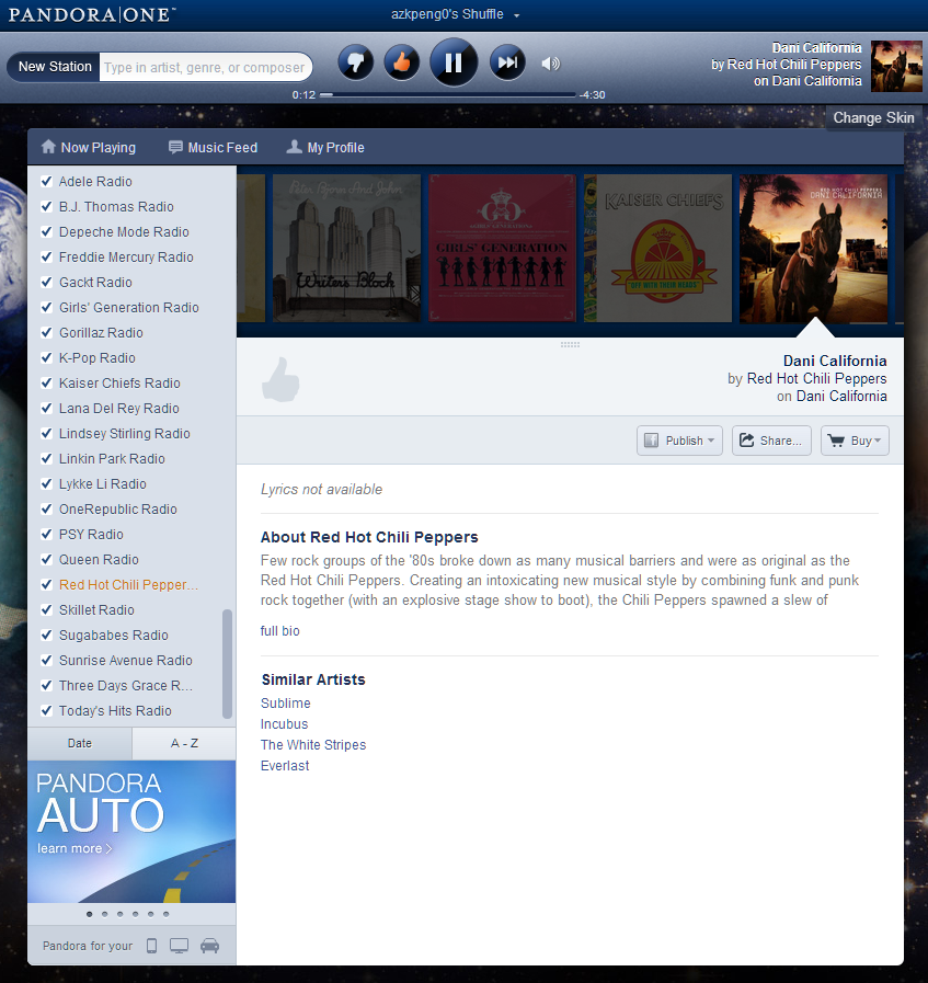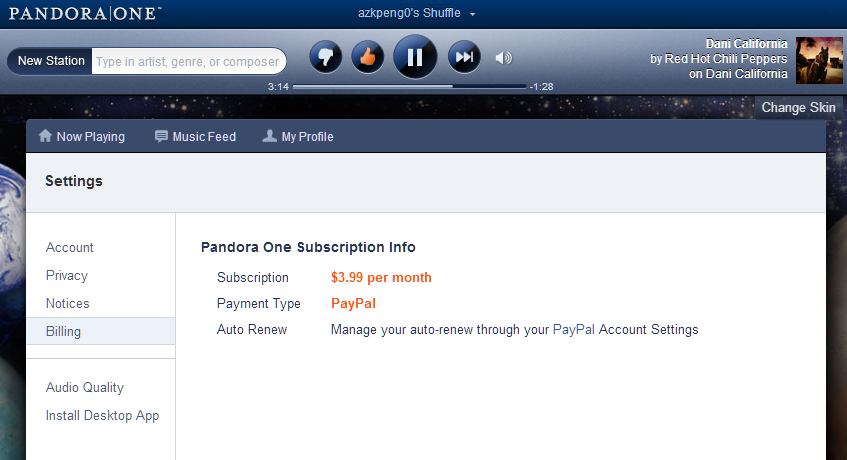 Ограничение Pandora, которое иногда меня раздражает – ограниченное количество пропусков композиции (даже дизлайком). Купив Pandora One, пропускать можно чаще, но тоже не всегда. Еще премиум-подписчик может менять скины (фоновые картинки). На платной подписке качество аудио-записи 192kbps вместо 128kbps. Разницы, если вы не аудиофил, вы не почувствуете. Остальные прелести платной версии пандоры, увы, недоступны вне США и чтобы ими воспользоваться, нужно уже поизвращаться. К сожалению, приложение для андройда и ios тоже попадают в это ограничение. Ничего критичного я не ощутил, купив Pandora One.