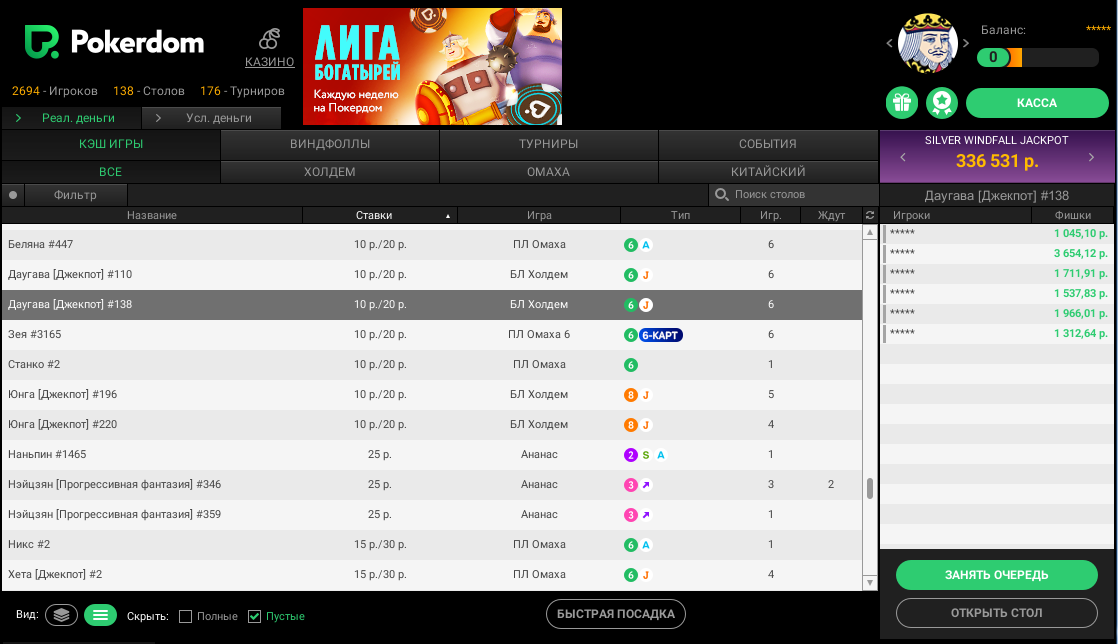 После 23 марта лобби кеш-игры на Покердоме выглядит так: