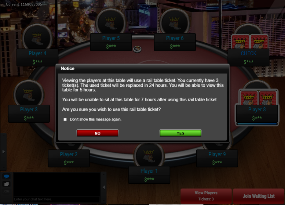 Но на PokerKing есть странная опция с возможностью «подсмотреть» за столом. Каждому игроку начисляются 3 билета (rail table ticket) в 24 часа. Используешь билет — никнеймы, стеки игроков, информация об игроках в листе ожидания открывается на 5 часов. Но пропадает кнопка «Присоединиться к игре», и сесть за стол нельзя в течение 7 часов после активации билета.