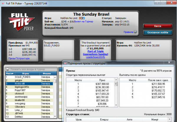 Известный российский профессионал, титулованный онлайн и оффлайн игрок - Андрей "Zaya" Заиченко (Kroko-dill) занимает 3-е место на одном из главных воскресных турниров на Full Tilt Poker - Sunday Brawl. Учитывая то, что данное событие проходило во время промо-недели в крупном онлайн покер-руме, турнир имел большую гарантию, возможность сделать мульти-вход ну и, разумеется, большее количество участников. Всего было выполнено 9 974 входа, что стало своеобразным рекордом для Sunday Brawl. 945 человек составили ITM-зону, поделив между собой призовой фонд в $1 994 800.