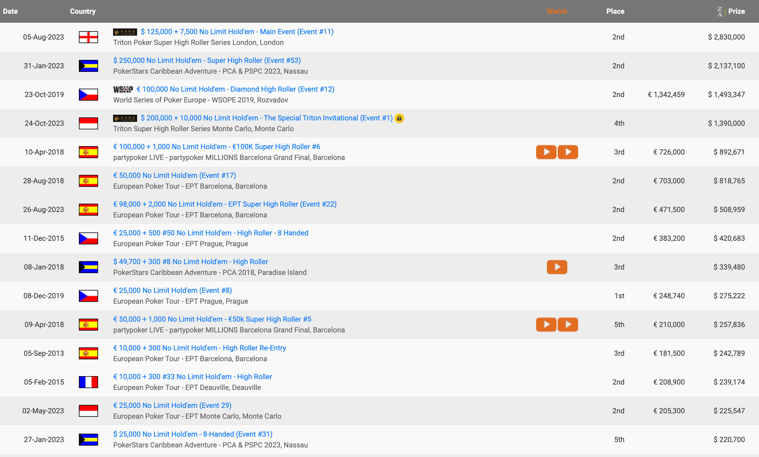 - в августе занял 2 место в $125K Main Event Triton London ($2,83M)