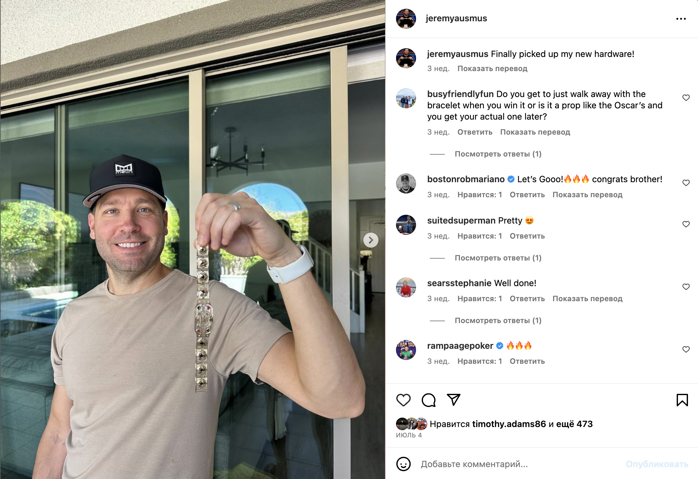 Джереми Осмус обладатель 6 браслетов WSOP, один трофей он выиграл на WSOP 2023.